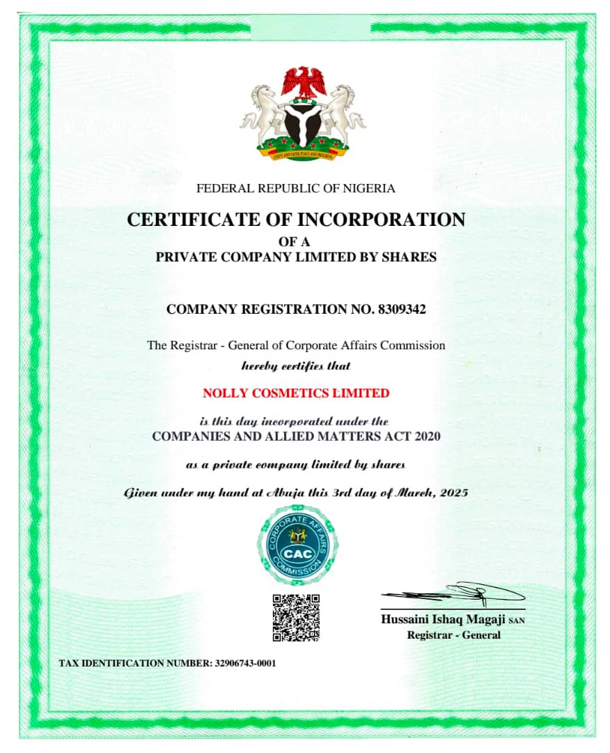 Nolly Cosmetics Limited is a private company limited by shares, fully incorporated under the Companies and Allied Matters Act 2020.